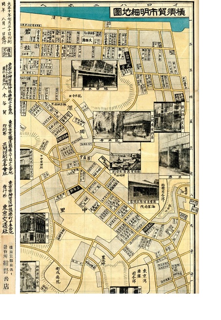 「商工地図」と称される民間作成の都市地図が、明治末から昭和期にかけて、全国各地で作成・発行されました。この「横須賀市明細地図」は、現存する東京交通社発行「職業別明細図」シリーズ中、最も古い発行のものということです。縮尺の記載はありませんし番地も入っていませんが、大正期の商店などの情報がわかる資料としては希少なもので、参考文献(1)にも復刻で収載されています。