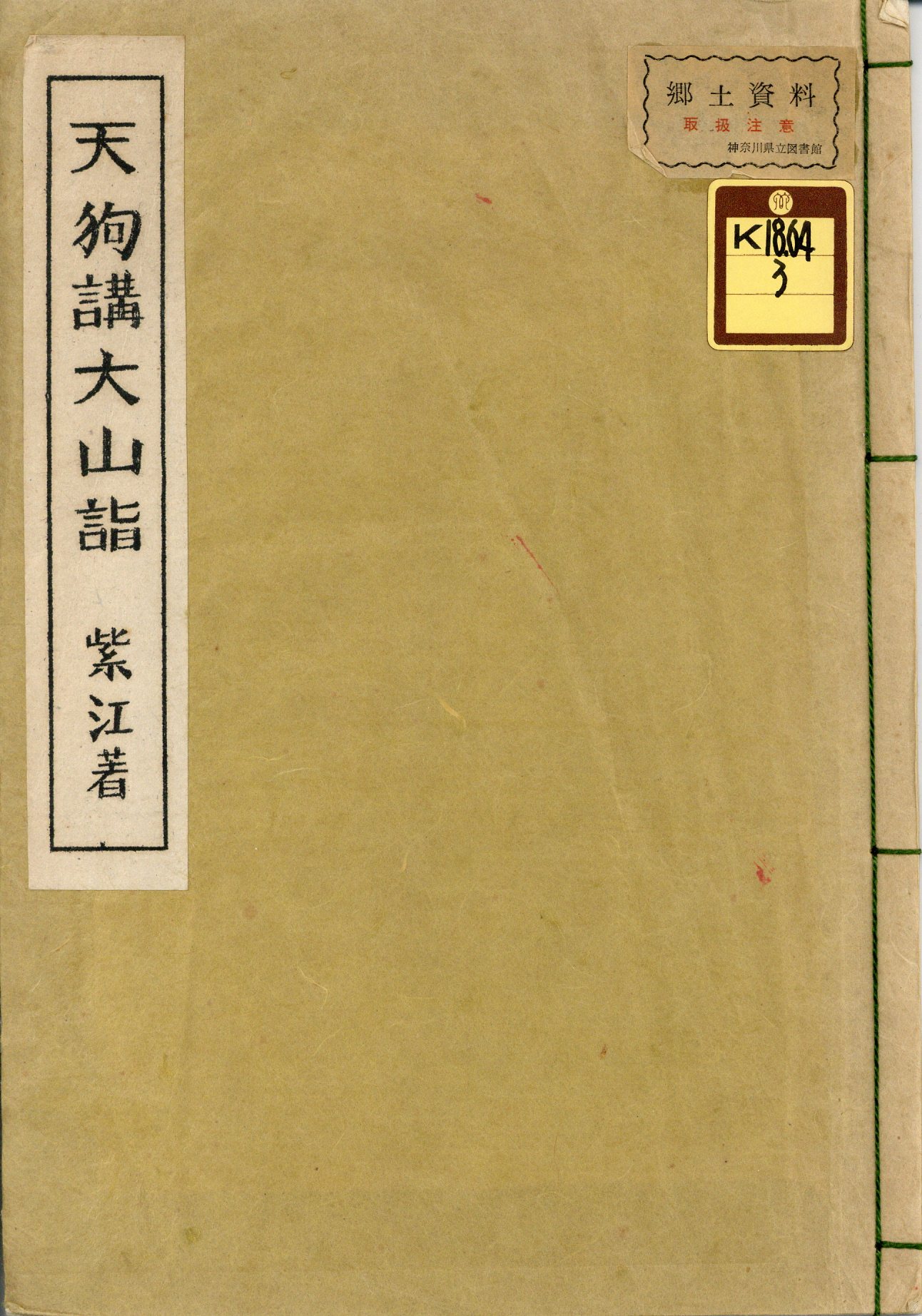 本書は、著者が昭和31(1956年)年5月26日に行われた「天狗講発会式」と、翌日に行われた「酒祭り第五回」に参加し、その様子を記したもので、大山の歴史的考察も加えています。騰写版で、奥付に「限定五十部 第七冊」("七"は手書き)とあります。「天狗講」とは小生夢坊を主催とする文化集団で、「平和祈念の大山カーニバル」と記されています。画家・随筆家・社会評論家であった小生夢坊(1895年から1986年まで)は、石川県金沢市に生まれ、19歳で『中越日報』の編集長を務めます。上京後は浅草に住み、浅草に集う文化人・芸能人らの要となりました。また、一葉記念館、下町風俗資料館の建設にも尽くしています。著書に『天狗まんだん』などがあります。