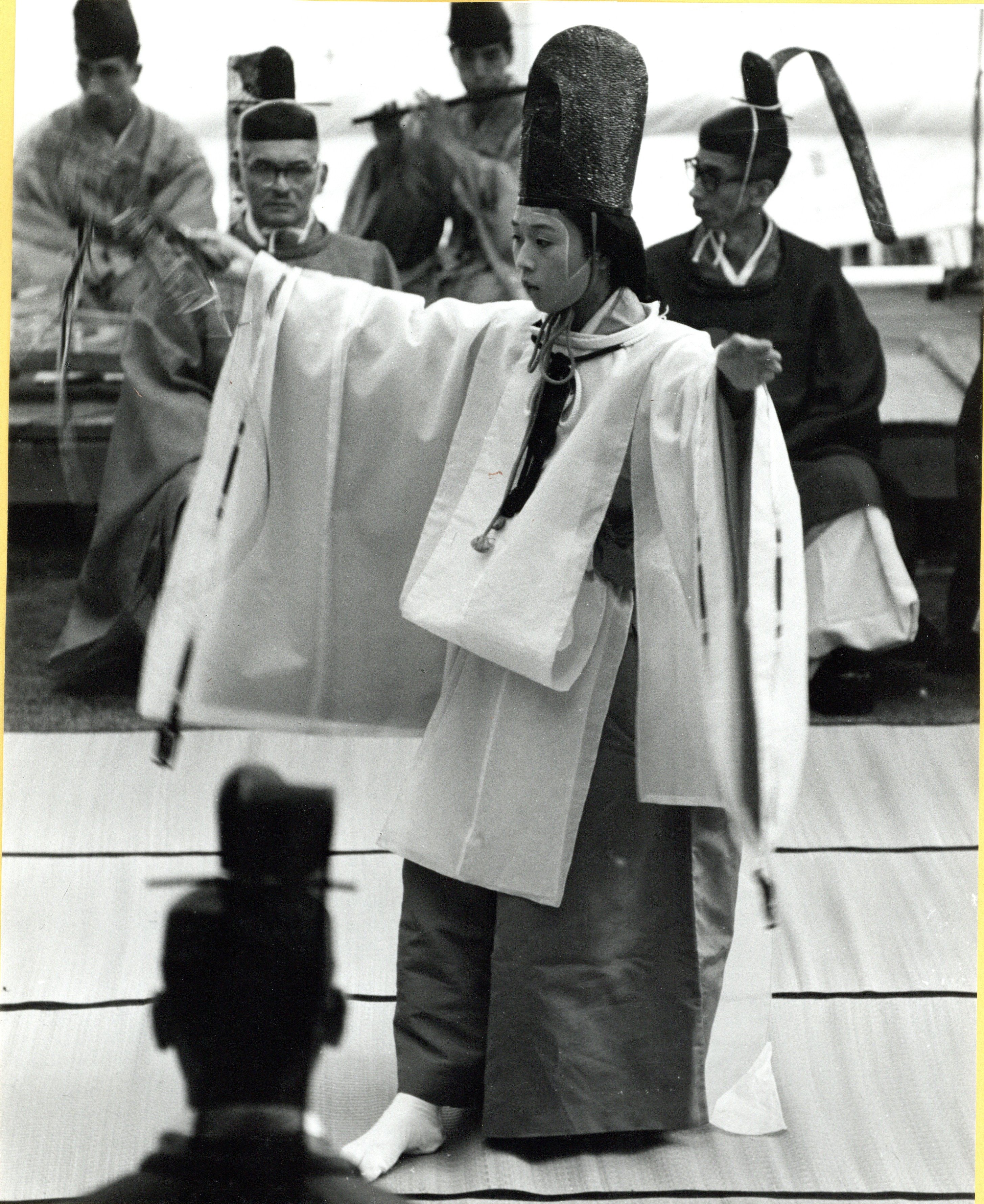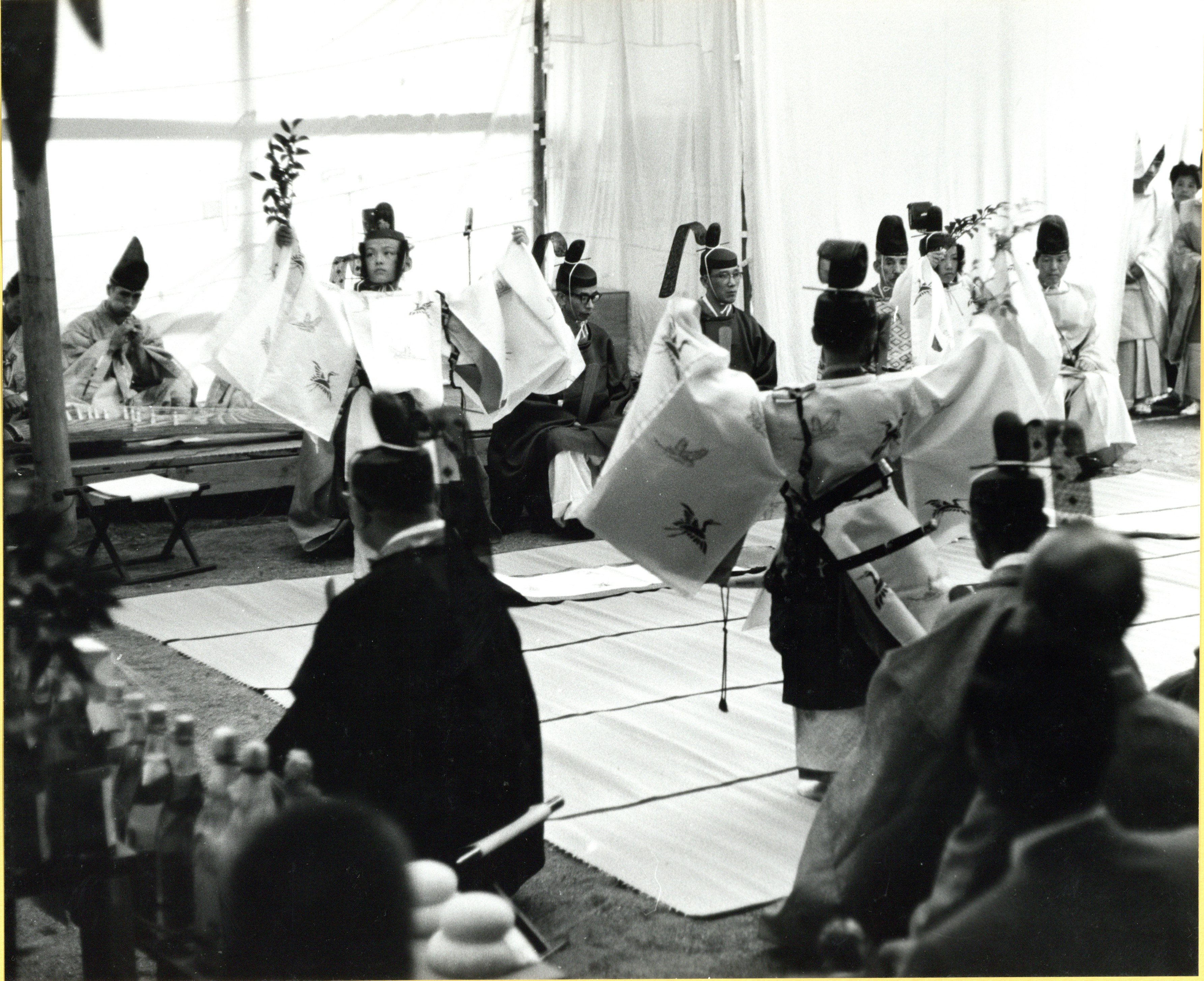 本書には、発会式の当日は無形文化財の「大和舞」と「大山能狂言」、「林屋正蔵」の落語「大山詣」が行われ、翌日に「包丁式」(材料に手をふれず包丁と箸だけで調理する儀式)と「巫子舞」が行われた、と書かれています。