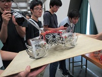 会場で「かわロボ」の魅力を聞いたところ、いつも優勝する人が定まっていないこと、他の参加者と交流できることと答えてくれた参加者がいました。決勝戦と特別戦に参加したロボットの展示があり、ロボットを介して参加者同士が情報交換する姿が多く見られました。会場でおススメのロボットを聞いたところ、どんな凹凸があっても、制御機能を搭載した脚によって水平を保つロボットを紹介してもらいました(写真参照)。