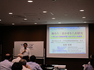 講師には、横浜国立大学大学院環境情報研究院教授の長尾智晴先生をお招きしました。長尾先生は大学でのAI研究の傍ら、自らも大学発のベンチャーを起業され、AI技術を活用した製品の開発研究に携わるほか、講演会やセミナーで講師をされるなど、多方面でご活躍中の方です。当館が「ものづくり技術を支える機能」に特化していることも踏まえ、ものづくりやビジネスの場で求められるAIの研究や技術の現状などについて、お話しいただきました。