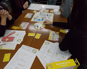 当日用意したゲームは、県内の観光地のひとつ鎌倉を巡り想い出を集める「kamakura collection」、戦国時代の城攻めをテーマにした「ライナー・クニツィアの戦国時代」、感染症から人類を守る協力型ゲーム「Pandemic」、庭園の美しさを競う「枯山水」、大航海時代にカタン島の開発競争をする「カタン」の5ゲーム7テーブルです。